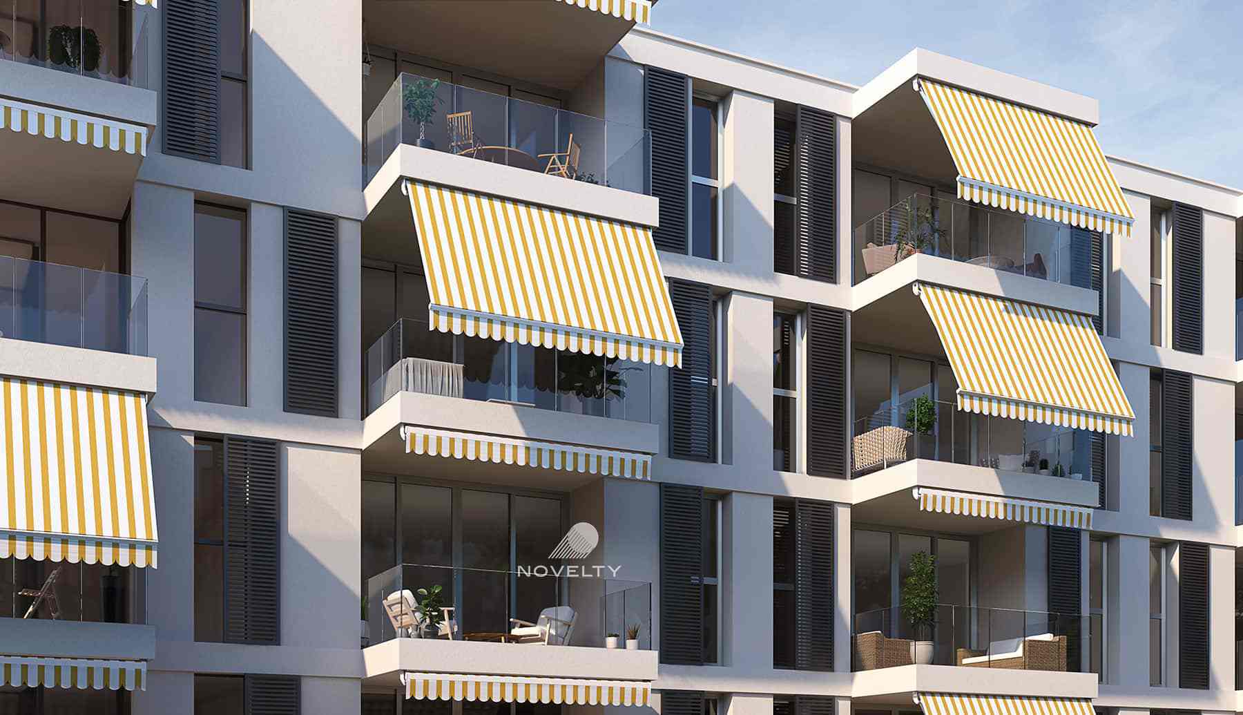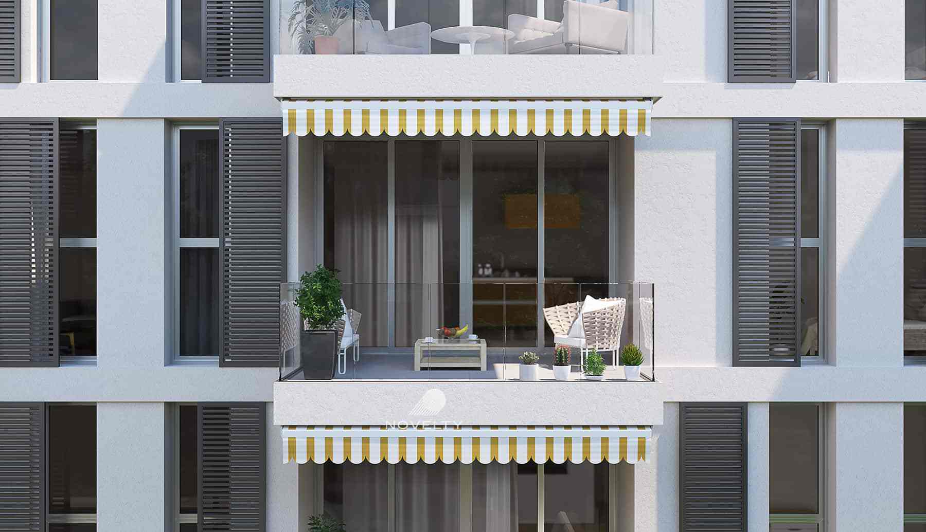 Toldo de brazos invisibles caracterizado por ser un modelo funcional y atractivo que cuenta con la última tecnología en sistemas para toldos. De tamaño medio, se adapta a todo tipo de terrazas y fachadas.